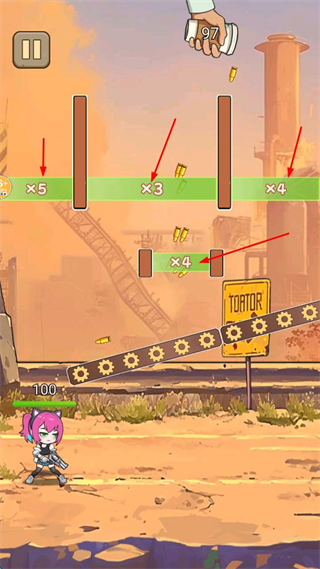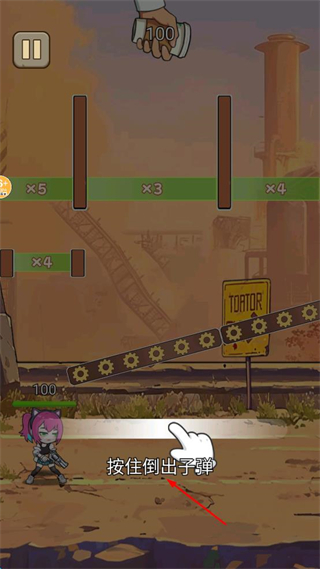 1、開局按提示按住倒出子彈,讓子彈經倍數區域增益,精準打擊路徑上敵人。