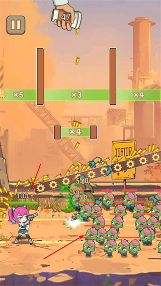 2、利用場景中5、3等倍數標識,引導子彈經過,提升傷害,高效清理僵尸群。