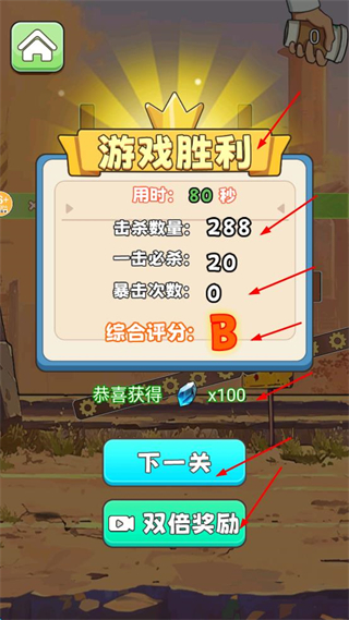 4、勝利后看結算,點擊下一關繼續挑戰,家或者選擇雙倍獎勵看視頻獲更多資源。