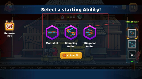 1、可選擇多重射擊、彈跳子彈、斜向子彈三種初始技能,不同技能適配不同敵人類型,建議根據后續關卡敵人分布選擇對應技能。