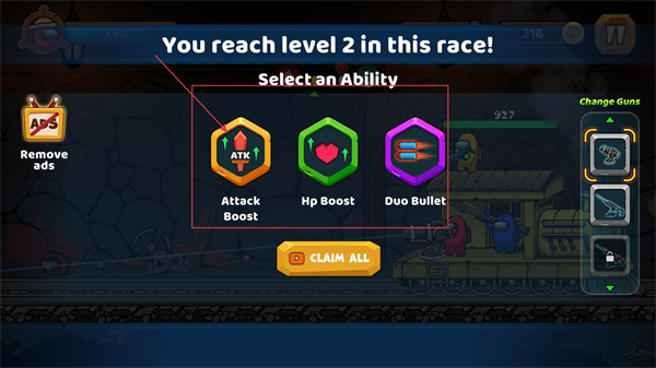 3、升級至2級后可選擇能力強化,包括攻擊提升、血量增益、雙發子彈三種選項,需根據當前戰斗壓力選擇適配強化,攻擊提升可增強輸出。