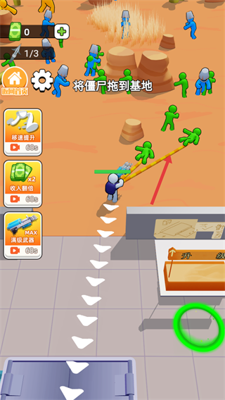 1、操作時需將僵尸拖到基地,按指引沿白色箭頭路徑移動角色,完成拖拽后可推進流程。