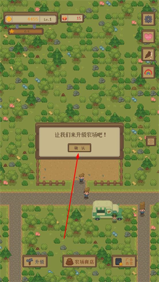 1、打開游戲進入農場界面,看到升級農場的提示彈窗,點擊確認按鈕關閉彈窗,準備進行農場升級。