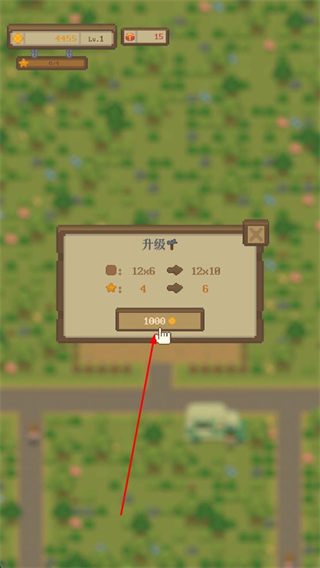 2、農場界面底部找到升級按鈕,點擊該按鈕,彈出升級所需資源的窗口,查看對應的材料及貨幣要求。