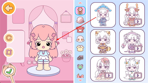 4、進入角色裝扮界面從右側選擇發型服飾等裝扮元素,點擊對應元素可應用到角色身上,調整角色外觀,完成個性化裝扮設置。