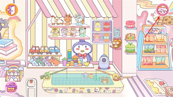 2、店鋪內部場景查看貨架上的物品和裝飾擺件,體驗店鋪內的趣味玩法,解鎖對應的互動內容,點擊上方的頭像按鈕。