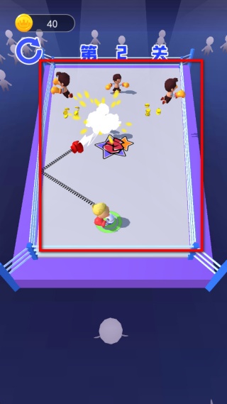 1、進入關卡后操控角色,通過拉扯彈簧拳頭瞄準場內對手,擊中后可擊敗對方并獲取金幣,每關會有不同數量的對手等待挑戰。