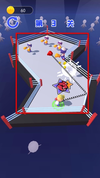 3、關卡場景會有變化,部分關卡的擂臺形狀會調整,需根據新場景調整拳頭的拉扯范圍,確保能覆蓋到更多對手完成擊敗。