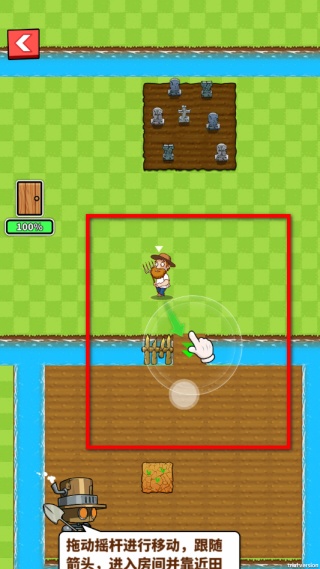 1、拖動搖桿控制角色移動,跟隨箭頭指引進入房間并靠近田地,這是開啟后續操作的基礎,完成后即可開展田地相關的建設。