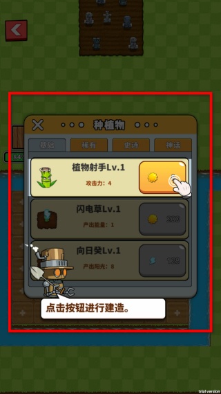3、打開種植界面選擇不同類型的植物,比如植物射手閃電草等,消耗對應的資源點擊按鈕進行建造,這些植物能提供攻擊或產出。