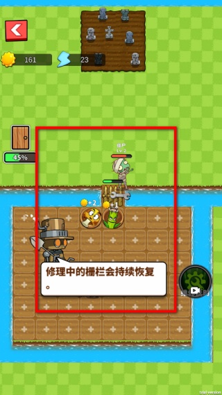 4、關注修理中的柵欄,它會持續恢復狀態,同時建造的植物會自動運作,產出資源或抵御來襲的敵人,保障農場的安全。