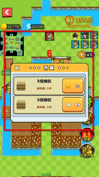 1、打開升級界面選擇柵欄,消耗對應資源升級到3級,升級后的柵欄耐久提升至115,能更好抵御敵人進攻,也可選擇免費方式獲取升級。