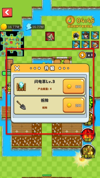 2、在升級界面找到閃電草,消耗資源將其升級到3級,提升產出量至4,若不需要該植物,也能消耗資源點擊拆除按鈕移除它。