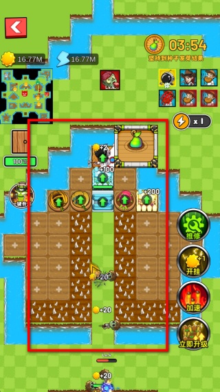 3、在農場區域布置植物,不同植物會自動運作產出資源,同時擊敗來襲的敵人可獲得額外收益,積累資源用于后續的升級和建設。