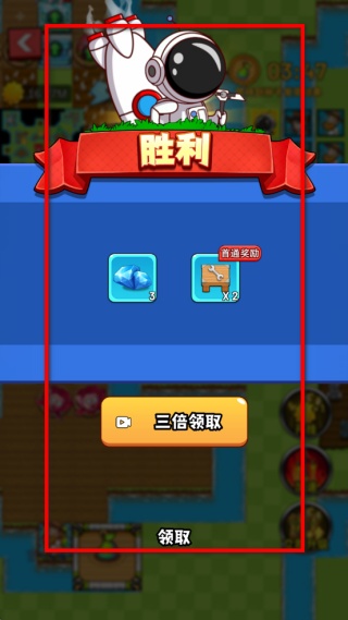 4、完成關卡后出現勝利界面,可直接領取包含鉆石和道具的獎勵,也能通過觀看內容領取三倍獎勵,領取后即可開啟新的防御挑戰。