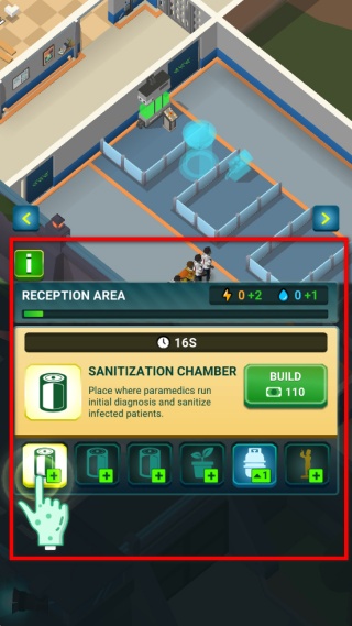 1、先解鎖消毒室,它是給僵尸做初步診斷和消毒的地方,點擊建造按鈕消耗對應資源就能解鎖,建好后就能接收首批僵尸病人開始處理。