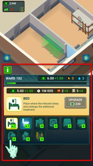 3、升級病房里的床具,床是給僵尸休息和接受額外治療的地方,消耗資源點擊升級按鈕,能提升病房的治療效率和容納病人的數量。