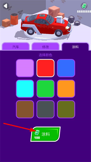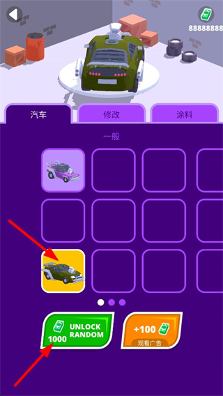 3、進入車庫界面后,選擇新的汽車樣式,點擊按鈕消耗資源,即可解鎖對應的新載具。