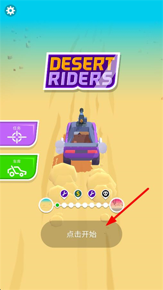1、可看到任務車庫等選項,點擊界面下方的點擊開始按鈕,即可開啟沙漠里的對戰玩法。
