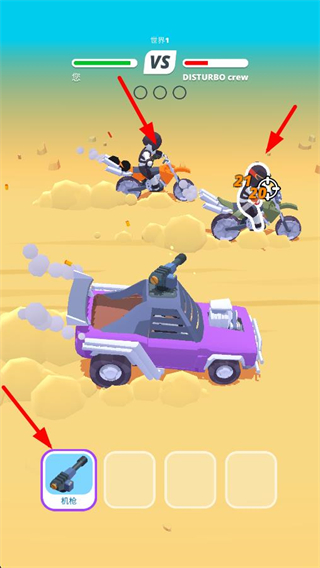 2、對戰時選擇下方的機槍武器,瞄準敵方的摩托載具進行攻擊,削減敵方血量,同時注意自身的狀態來推進戰局。