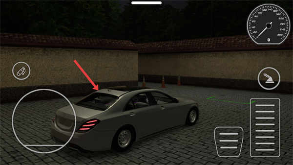 4、進入駕駛界面后,通過虛擬按鍵操控車輛,包含轉向、油門等功能,界面會顯示車速表與任務區域,需按要求操控車輛完成泊車等目標,推進游戲進程。