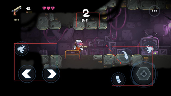 3、關卡內操作界面包含方向鍵、技能鍵與裝填鍵,方向鍵控制角色移動,需配合操作以應對不同敵人的攻擊節奏。