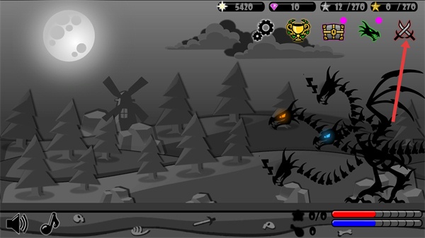 1、進入游戲界面后,點擊右上角的武器圖標可觸發戰斗相關操作,界面頂部會顯示當前資源數值,底部的進度條對應角色狀態,需關注這些信息來推進戰斗流程。