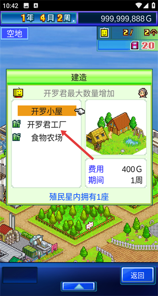 2、在游戲主界面中選定空地,打開建造菜單,在列表里選擇想要建造的設施,查看其所需費用和時間等信息。
