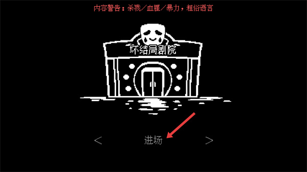 1、看到界面顯示的【壞結局劇院】入口后,點擊下方進場按鈕即可進入游戲,需注意內容警告提示的元素,此操作是開啟游戲劇情的第一步,直接觸發后續選擇環節。