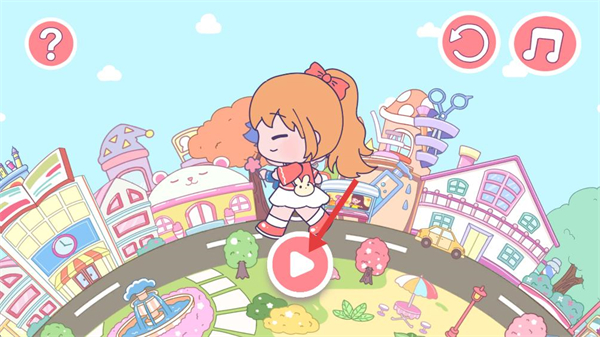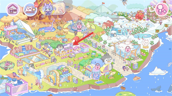 2、進入小鎮主場景,可看到各類建筑與裝飾元素,點擊特定建筑如粉色標識建筑,即可進入對應的室內場景,開啟場景互動。