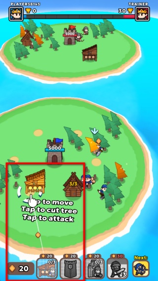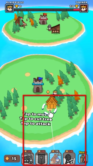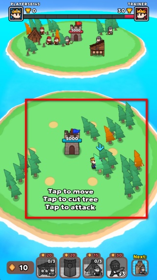 1、點擊操作控制角色移動,遇到樹木點擊可砍伐獲取資源,遇到目標點擊能發起攻擊,通過這些操作逐步推進游戲進程。