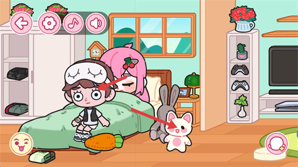 4、切換至臥室場景,可看到角色與玩偶等元素,移動角色或場景物品能觸發互動效果,同時界面還設有表情、裝飾等功能按鈕,適配多樣玩法。