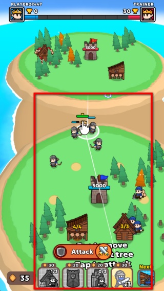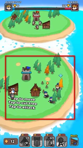 1、點擊操控角色移動到樹木旁,點擊砍伐樹木獲取資源,同時可以點擊指揮兵種行動,慢慢積累資源來升級建筑和兵力。