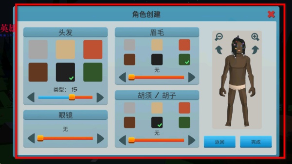 1、進入角色創建界面,選擇頭發眉毛等外觀選項,調整對應類型和樣式,選好后點擊完成按鈕,就能確定角色的初始形象。