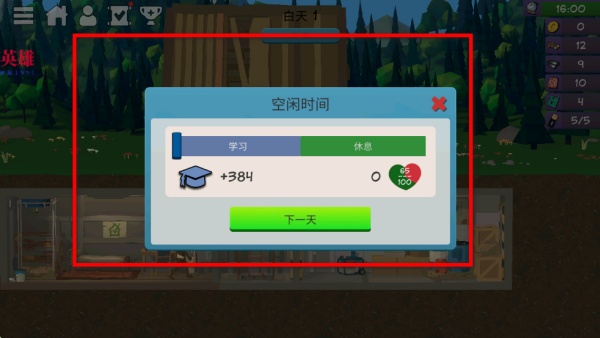 2、在空閑時間界面,可分配學習和休息的占比,學習能提升對應數值,休息會恢復體力,調整后點擊下一天推進游戲進程。