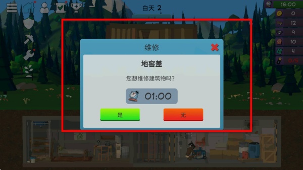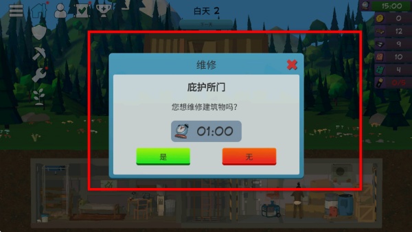 4、針對不同的建筑物比如庇護所門,同樣會出現維修確認界面,確認維修時間后點擊是,就能對該建筑進行修復操作。