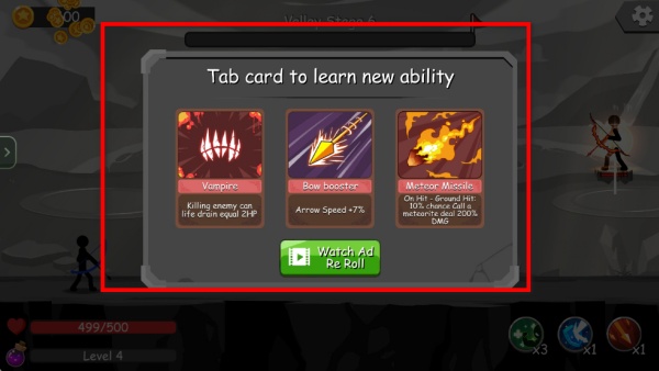 3、升級后會彈出技能選擇界面,可挑選不同的能力卡片,比如吸血弓箭強化等,這些技能能提升戰斗效率,也可刷新重新選擇。