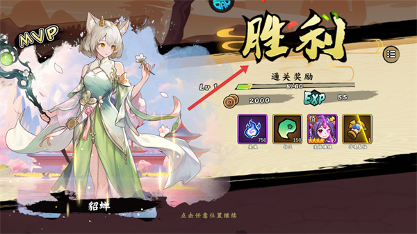 4、戰斗勝利后可獲得資源、經驗與道具獎勵,同時解鎖角色的MVP標識,點擊任意位置返回界面,積累獎勵可用于提升角色等級與屬性。