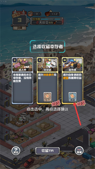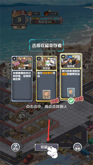 1、進入收留幸存者界面后,可查看不同幸存者的增益效果,選擇目標幸存者點擊選中,再確認收留,這些幸存者能為基地提供資源獲取、建筑升級等加成。
