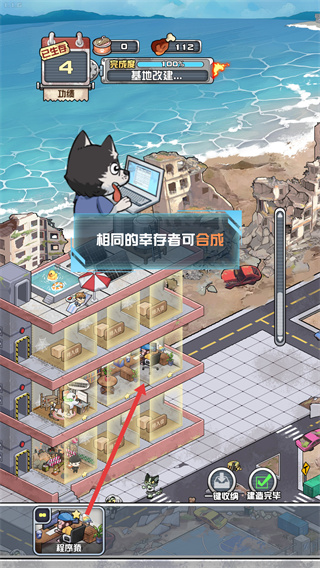 3、基地界面中,相同的幸存者可進行合成,合成后能提升其等級或增益效果,同時可通過建造房間拓展基地功能,合理布局房間以提升資源產出效率。