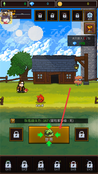 1、界面顯示隊伍戰斗力為167、冒險家等級暫無,可點擊下方【世界】按鈕進入探索界面,同時右上角有未解鎖的功能欄、當前消滅敵人數量為5、可獲得10鉆石,初始資源均為0。