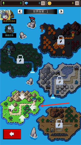 2、進入世界探索界面后,可見世界探索1的地圖,包含多個區域、部分區域處于鎖定狀態,可選擇已解鎖的區域進入,點擊對應區域即可進入該區域的具體場景。