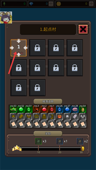 3、進入對應區域后,會顯示該區域的關卡列表,下方還能查看該區域的掉落道具、可點擊【獎勵】查看詳情,點擊關卡1即可開始挑戰。