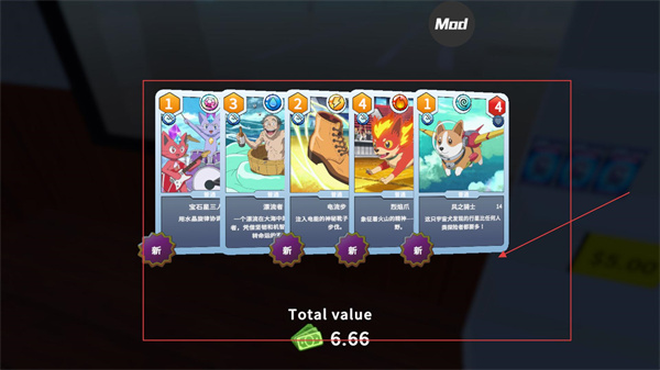 4、打開物品后會獲得多張卡牌,每張卡牌有對應屬性與描述,這些卡牌會累積總價值,可用于后續游戲內容的解鎖或兌換。