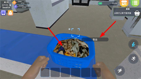 2、從架子上取下裝著臟衣服的籃子,點擊取出按鈕拿到臟衣服,這是洗衣流程的第一步,準備將衣物進行清洗處理。