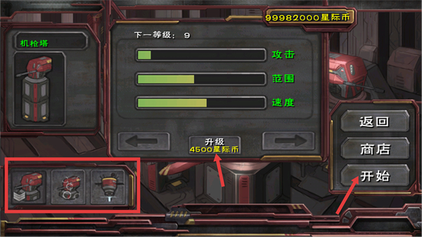 3、接著來到武器升級界面,左側顯示機槍塔等防御塔類型,選中后點擊升級按鈕,消耗星際幣提升防御塔屬性,完成后點開始進入戰斗。
