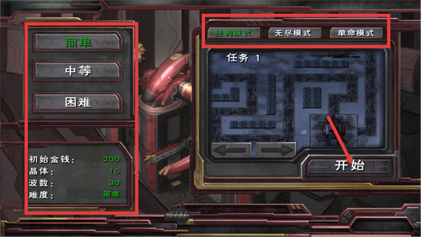 2、進入后可選擇難度,當前默認顯示簡單難度,同時有經典、無盡、單命三種模式可選,選定后點擊開始按鈕,就能進入對應的游戲關卡。