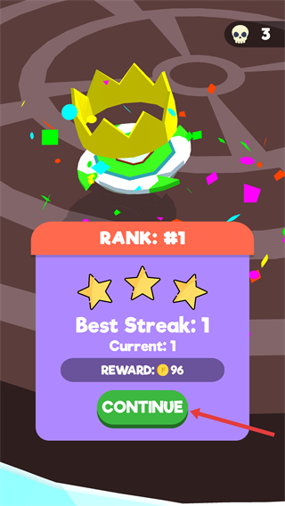 4、關卡結束后會展示排名界面,顯示【RANK1】及星級評價、獎勵金幣,點擊綠色【CONTINUE】按鈕,即可領取獎勵并進入下一個關卡。