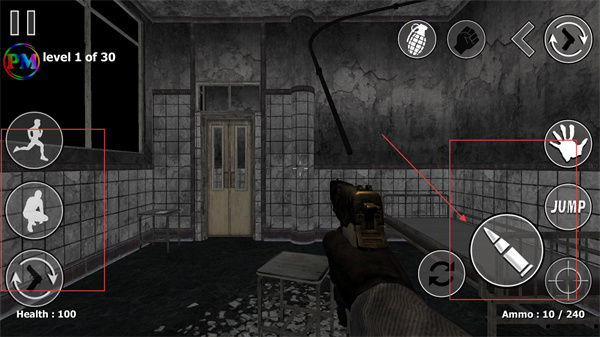 1、進入第1關的室內場景,左側是移動、切換武器的按鍵,右側是射擊、跳躍等功能鍵,先熟悉操作按鍵布局。
