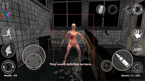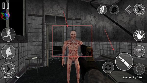 2、門后出現僵尸,利用右側射擊鍵攻擊目標,當前彈藥充足,優先集中火力擊殺靠近的僵尸,避免被近身攻擊造成損傷。
